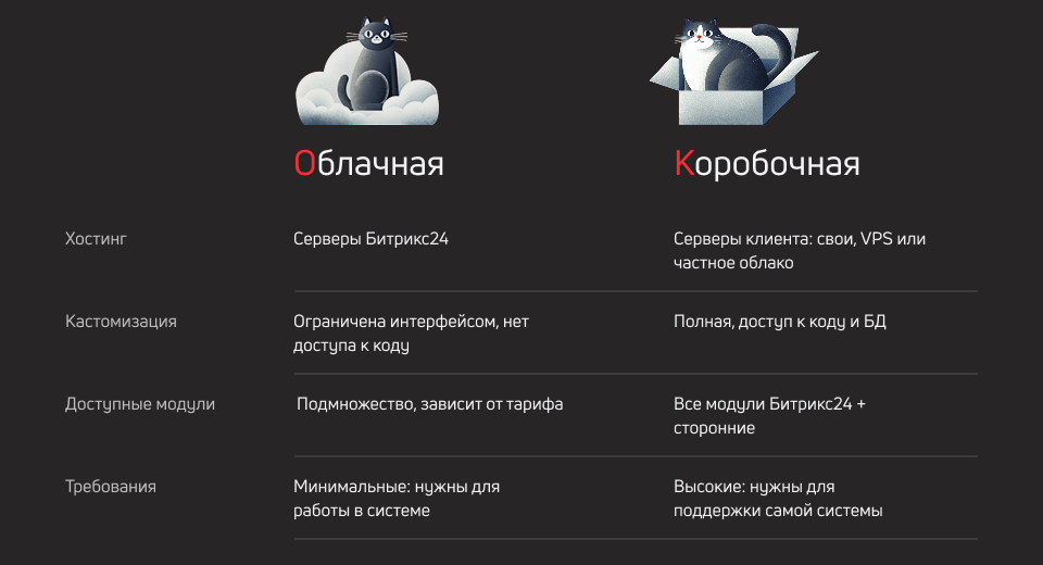 В Битрикс24 реализовано две версии: облачная и коробочная.