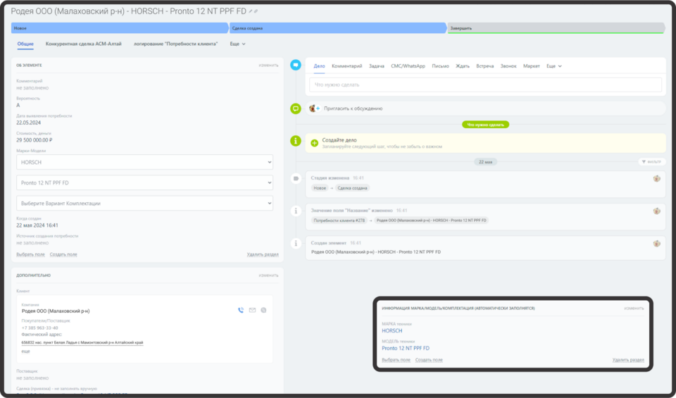 «Потребность» — это такой смарт-процесс, внешне очень похожий на сделку. С его помощью менеджер по продаже фиксирует намерение клиента. Например, фермер планирует в ближайшие три года обновить парк сельхозтехники и ему понадобится несколько тракторов определенной марки. Менеджер запишет эти данные в смарт-процесс «Потребность» и сможет настроить себе необходимые автоматические уведомления, чтобы в нужный момент напомнить фермеру об этих предварительных договоренностях.