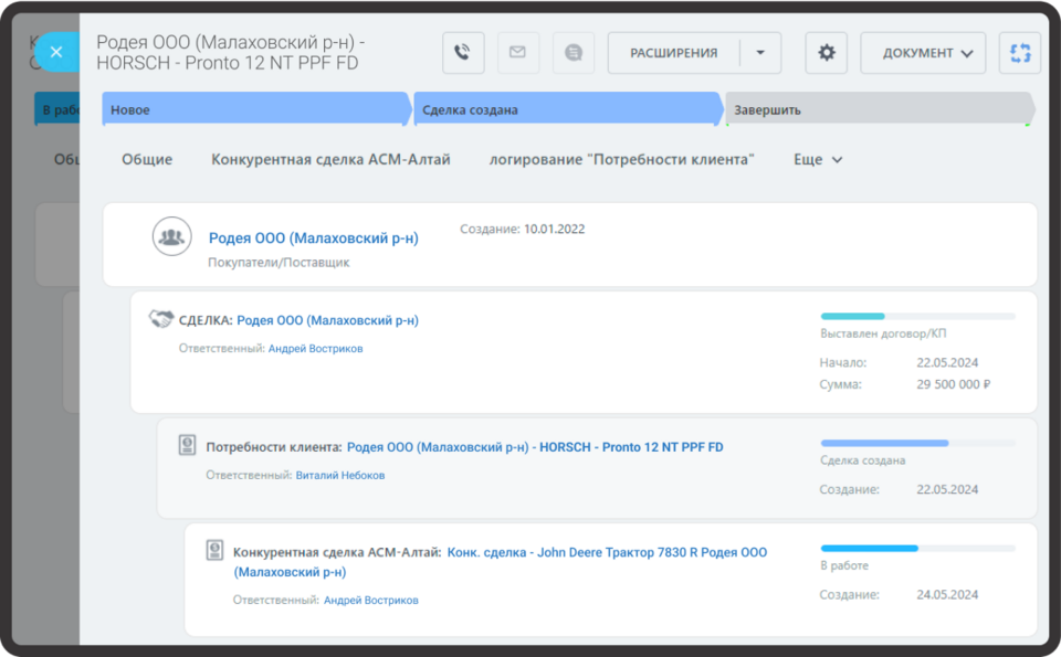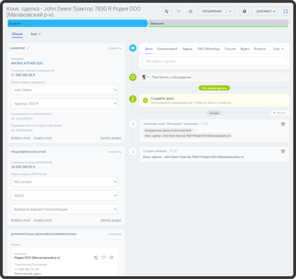 «Конкурентная сделка» — это еще один смарт-процесс, который работает в связке с «Потребностью». Туда менеджер вносит данные об альтернативном выборе потенциального клиента. Например, если фермер говорит, что возможно он хотел бы купить не трактор «Кировец», а китайский трактор или тот же «Кировец», но от другого поставщика, то менеджер внесет эти варианты в «Конкурентную сделку». Когда данных об альтернативах от разных клиентов накопится достаточно, то с помощью специальных отчетов можно будет проанализировать поведение клиентов и составить более полную картинку о текущей ситуации на рынке.