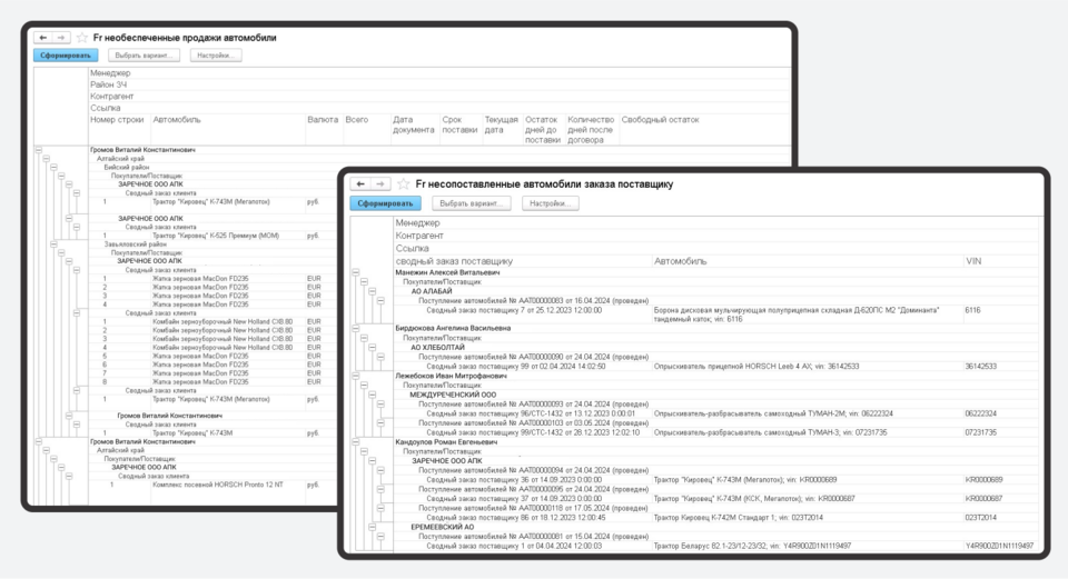 Мы провели комплексную работу по созданию возможности вести в «Альфа-авто» все три направления бизнеса клиента: продажу спецтехники, продажу запчастей и сервисное обслуживание. Наши 1С-разработчики реорганизовали структуру справочников, к каждому справочнику сделали свои связки документов и внесли необходимые изменения в бухгалтерский регламентный учет.