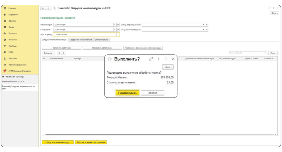 На следующем этапе пользователь загружает DBF-файл. При корректном заполнении полей и успешной обработке запроса формируется сообщение с запросом на подтверждение. В сообщении отображается текущий баланс организации и рассчитанная стоимость выполнения запроса.