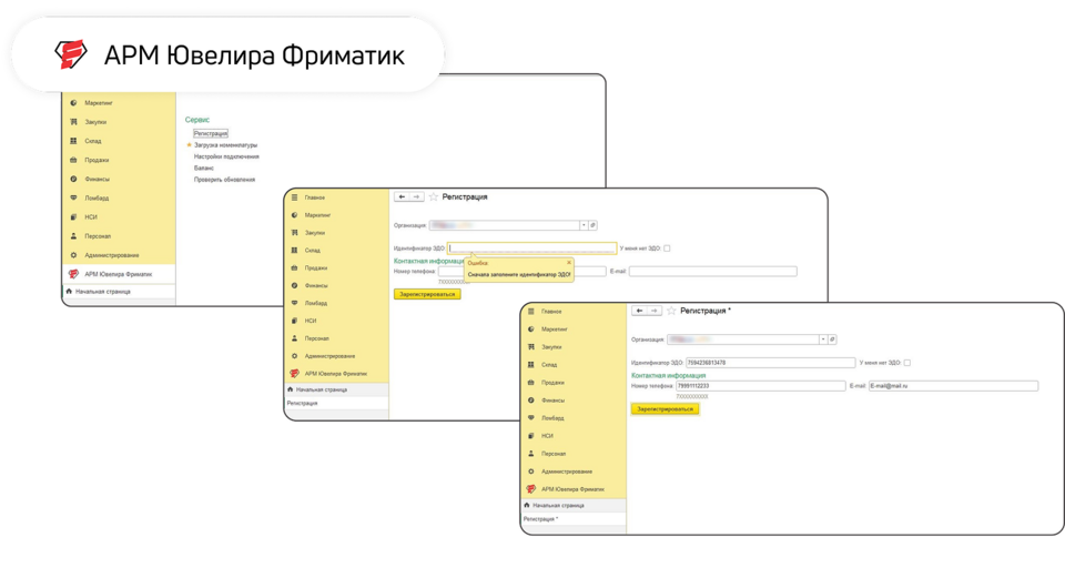 После скачивания и установки расширения, в базе появляется раздел «АРМ ювелира Фриматик», где пользователь регистрирует организацию.