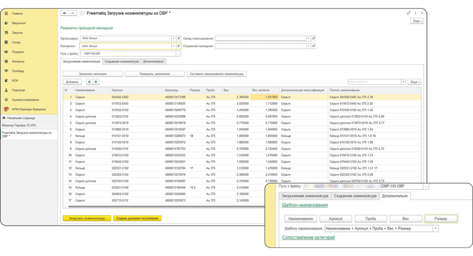 Благодаря этим функциям происходит автоматическое формирование номенклатуры по индивидуальным алгоритмам, быстрое создание приходных документов с привязкой к спецификациям из ГИИС ДМДК.