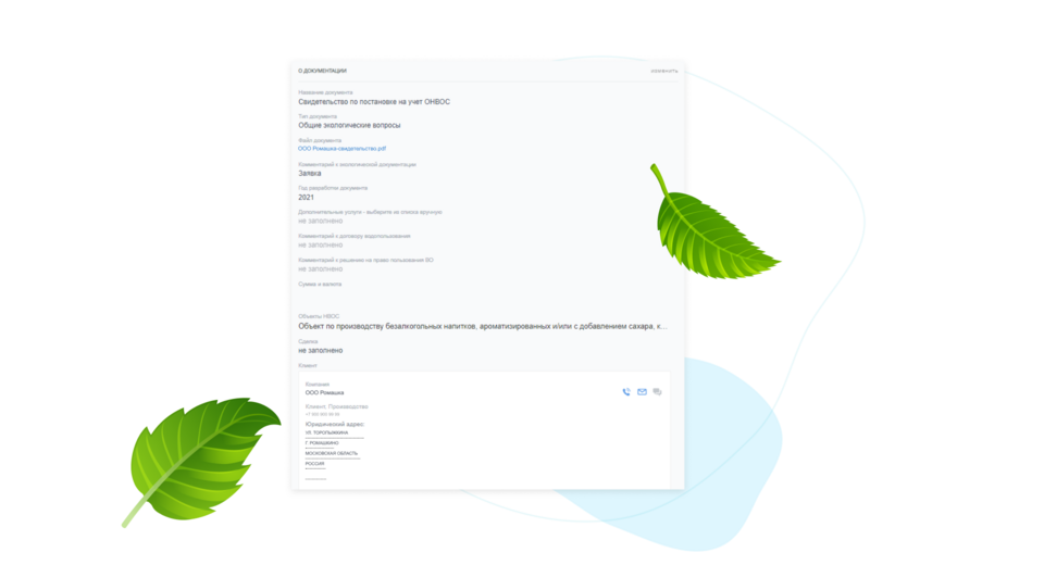 Помимо этого ведется учет экологической документации по каждой площадке. Он позволяет отслеживать, когда какие документы были разработаны и не устарели ли они. Например, в 2019 году Сибирский центр экологии и аудита подготовил для конкретной компании пакет бумаг. Вполне возможно, что к 2022 году на законодательном уровне уже произошли существенные изменения, влияющие на конкретный документ из пакета. Отдел продаж вовремя заметит это и при необходимости предложит актуализацию.